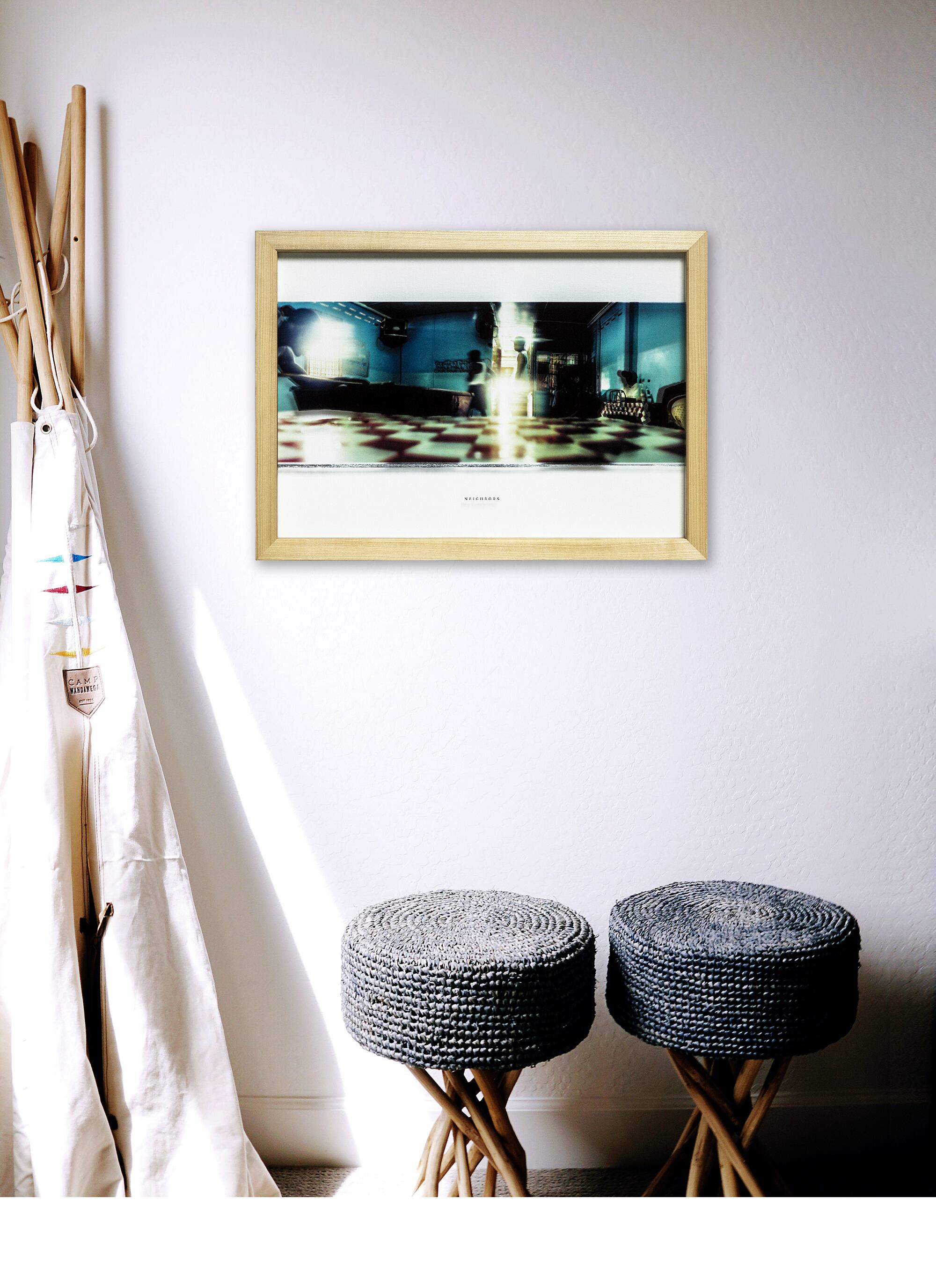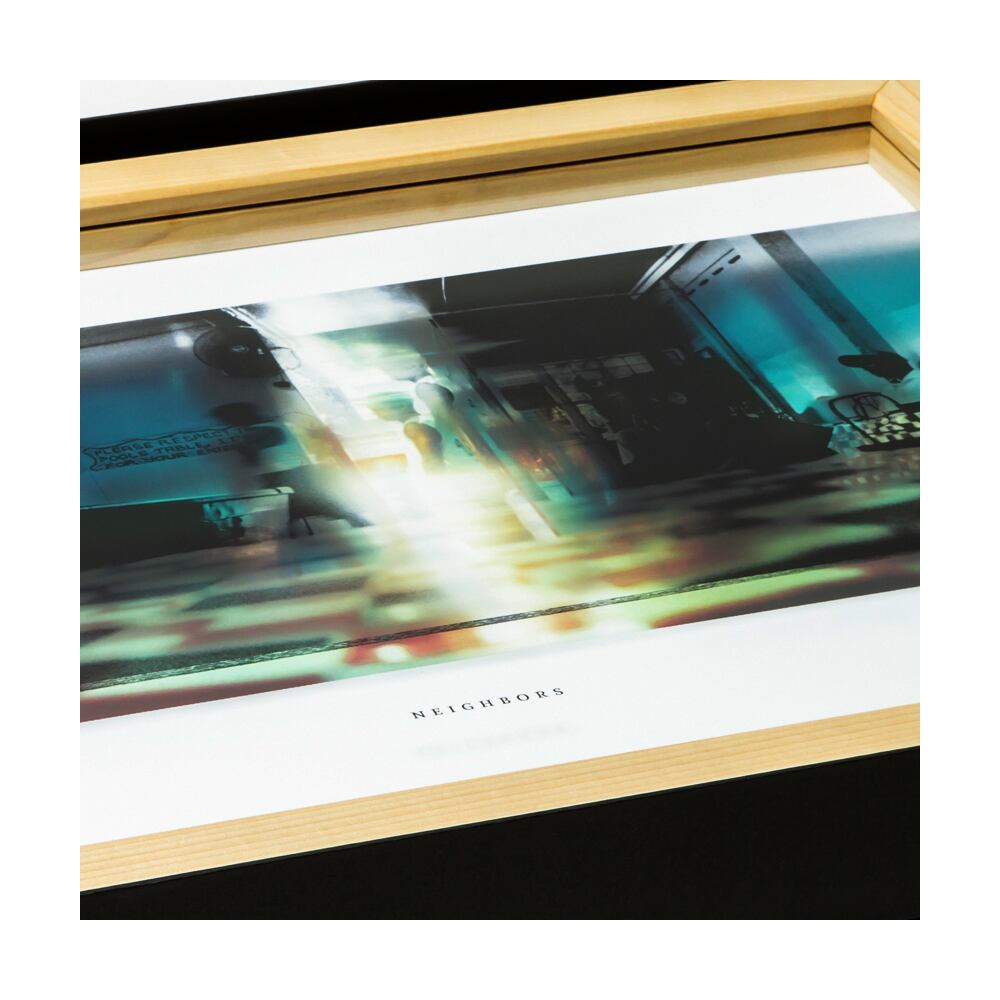 ガラスにUV印刷を施し、二層目のキャンバス生地にインクジェット印刷をすることで、平面の中にも奥行きや質感を感じる作品になります。